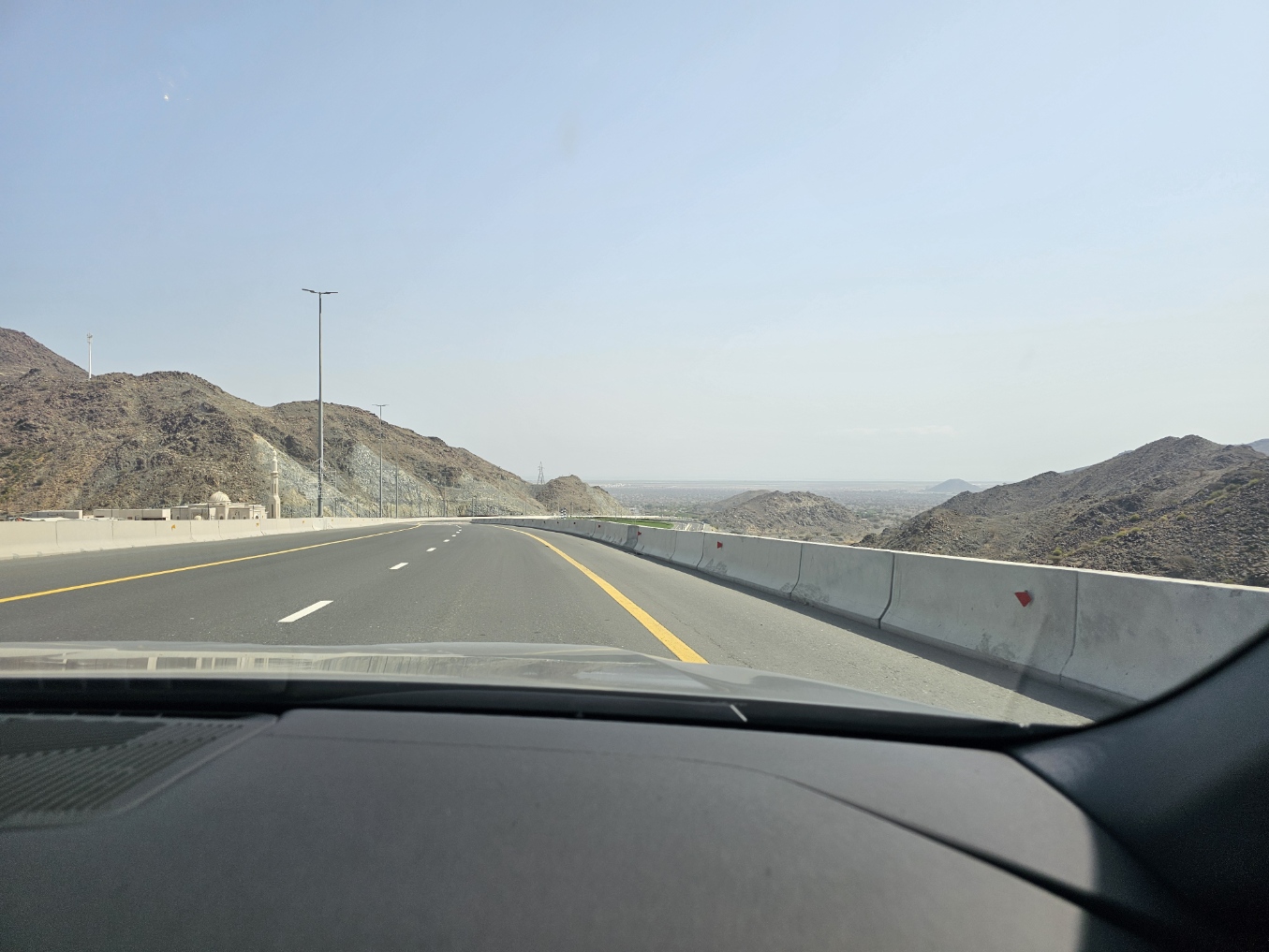 Pääsimme reilun puolentoista tunnin ajon jälkeen Omanin vastaiselle rajalle, mutta heti ensimmäisellä tarkistuspisteelläkin ilmeni ongelmia, kun automme papereista ei löytynyt oikeita lupia viedä UAE:n kilvissä olevia autoja pois maasta. Lopulta ilmeisesti toinen auto olisi ollut kelvollinen, mutta kun emme yhteen autoon mahtuneet, niin eipä tuo riittänyt. Kuljetusyritys sai kuitenkin upean nopeasti järjestettyä Omanin puolelta tila-auton meille matkan jatkamiseksi, ja jotenkin he saivat vielä puhuttua tuon auton tulemaan UAE:n puolelle rajaa hakemaan meidät eteenpäin, jottei meidän tarvinnut ylittää rajaa kävellen tai bussilla kuten kaikkien muiden matkaajien.