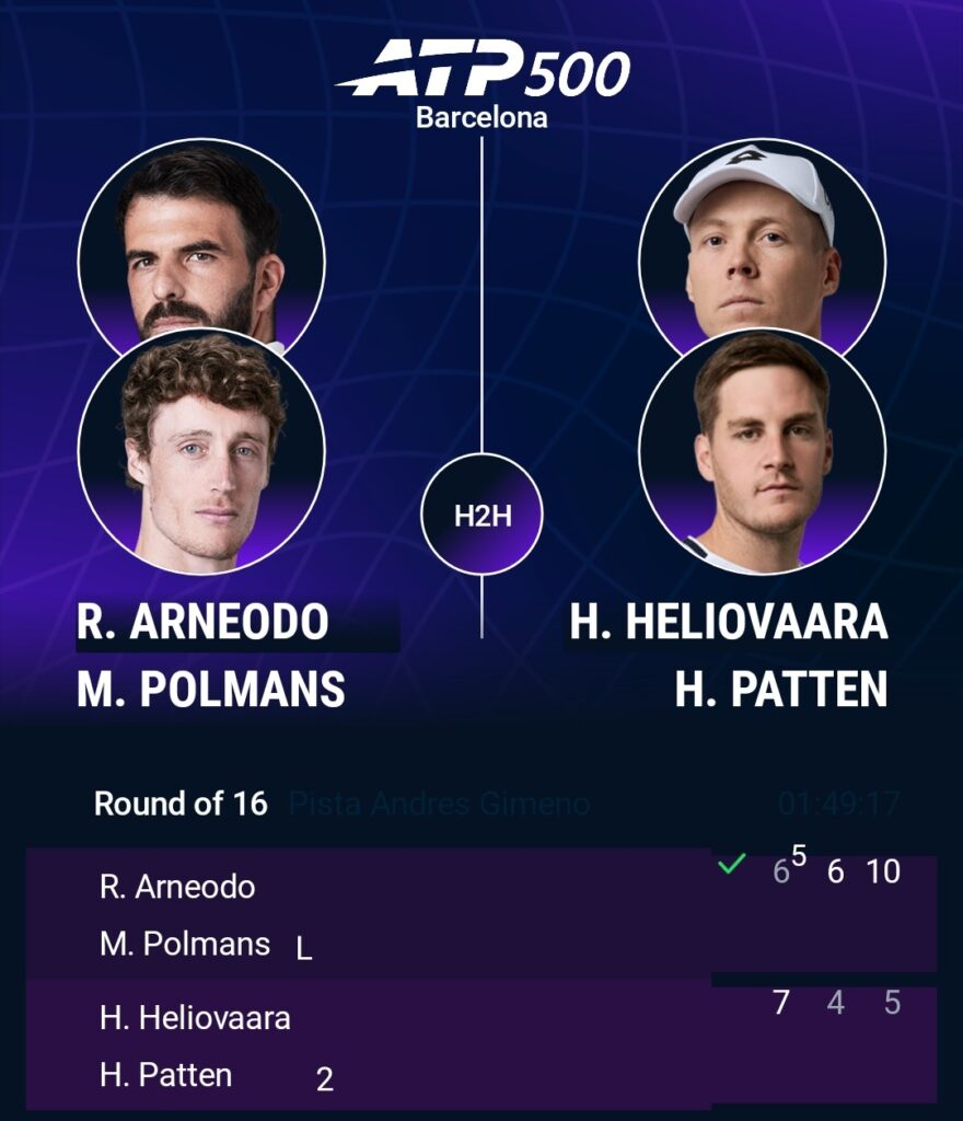 Barcelona ATP500 R16, Heliövaara/Patten – Arneodo/Polmans 7-6(5), 4-6, 5-10